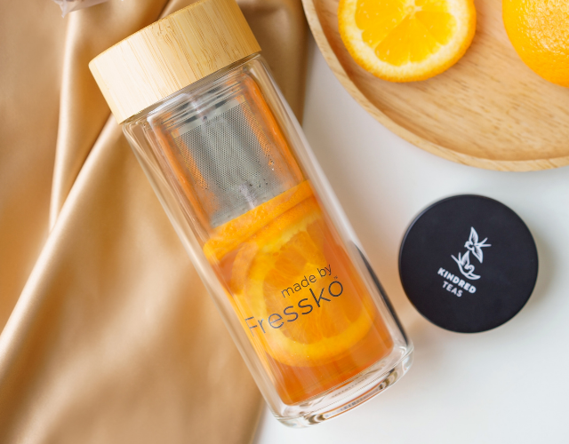 This award-winning, stylish borosilicate glass flask with a leak-proof bamboo lid comes with a removable tea infuser. Perfect for teas, fruit-infused water, or simply as a beautiful water bottle. Comes with laser engraved Kindred Teas logo on lid.